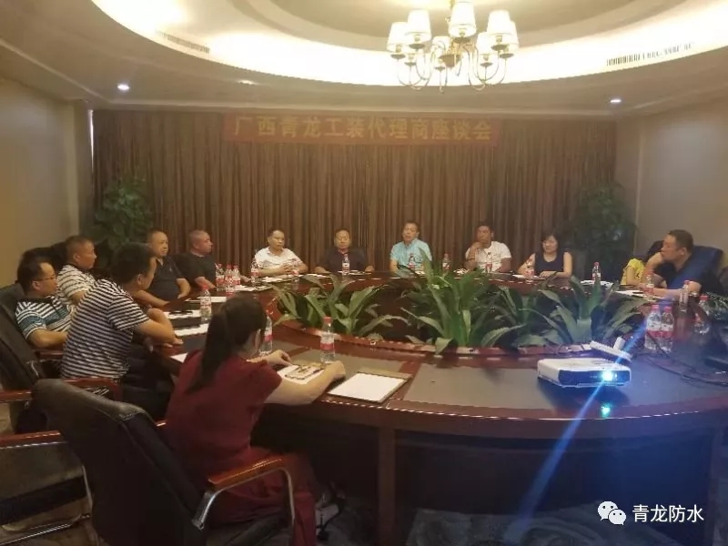 為共謀發(fā)展,攜手共贏,2019年6月22日至23日,青龍防水廣西代理商座談會(huì)在廣西北海曼哈頓酒店順利召開。青龍公司董事長宋敦清等青龍高層,以及南寧、北海、柳州、梧州、玉林、桂林、河池等市的青龍防水代理商,大家聚集一堂,通過分析總結(jié)、深入探討,對(duì)工程防水市場目前暴露出的問題、潛在的困難和發(fā)展瓶頸等課題進(jìn)行深入淺出的分析和研討。